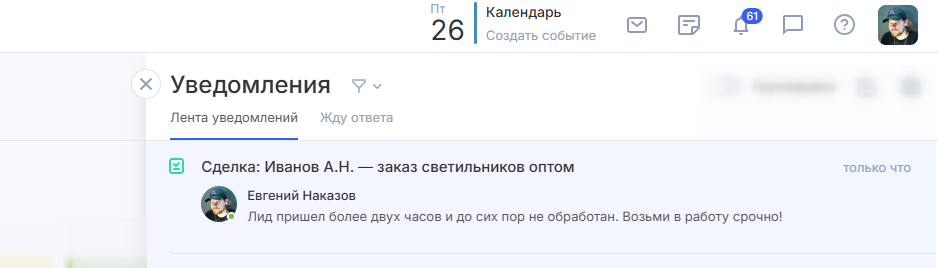 В CRM можно автоматизировать отправку уведомлений. Так вы сможете, например, присылать менеджерам напоминания о сделках, которые не были взяты в работу в течение определенного времени.