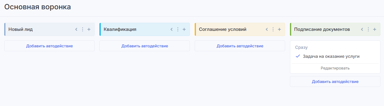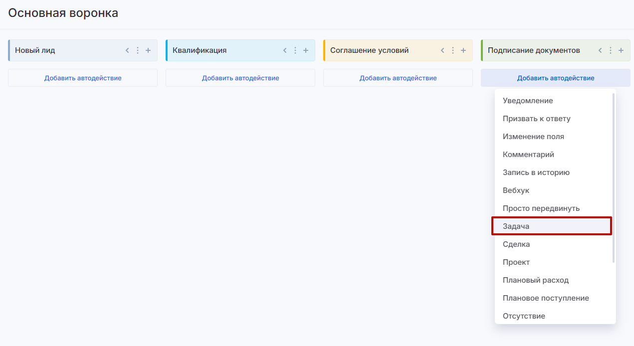 На экране «Автодействия» в воронке продаж выберите нужный этап и добавьте автодействие типа «Задача».