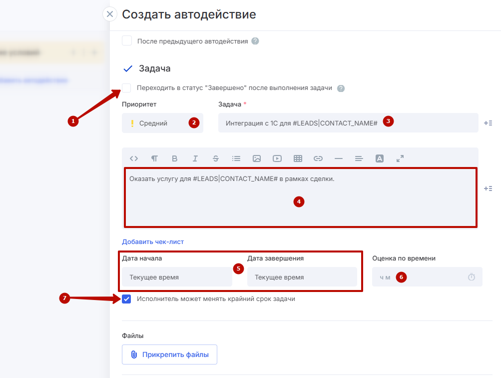 если хотите позволить исполнителю менять дедлайн задачи, также поставьте галку в чекбоксе (7).
