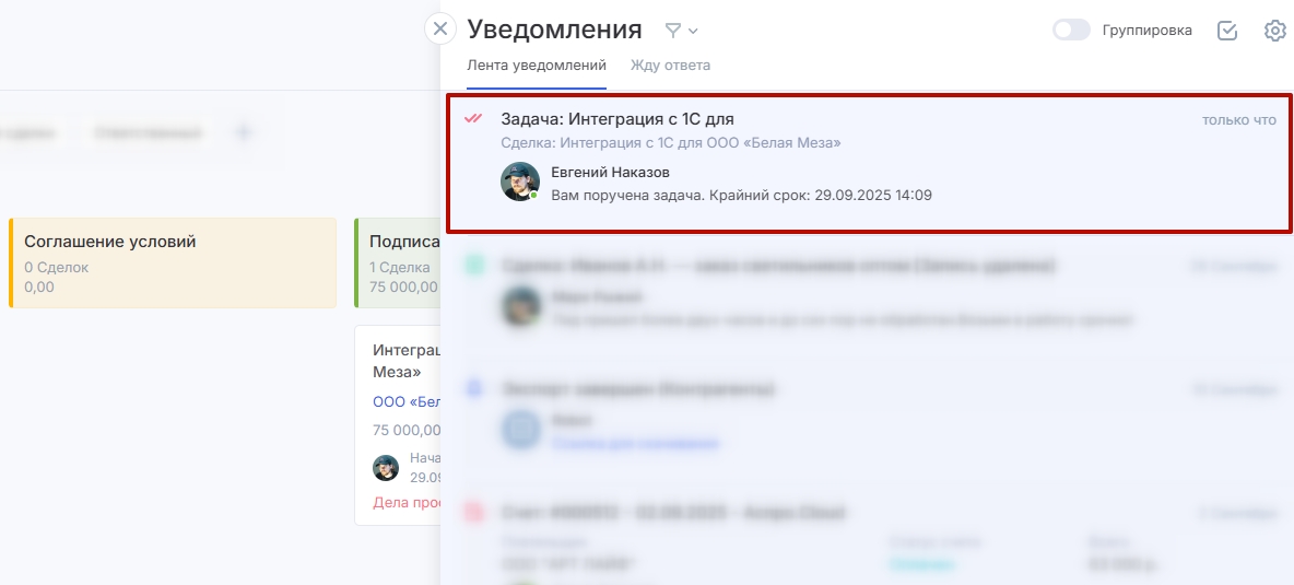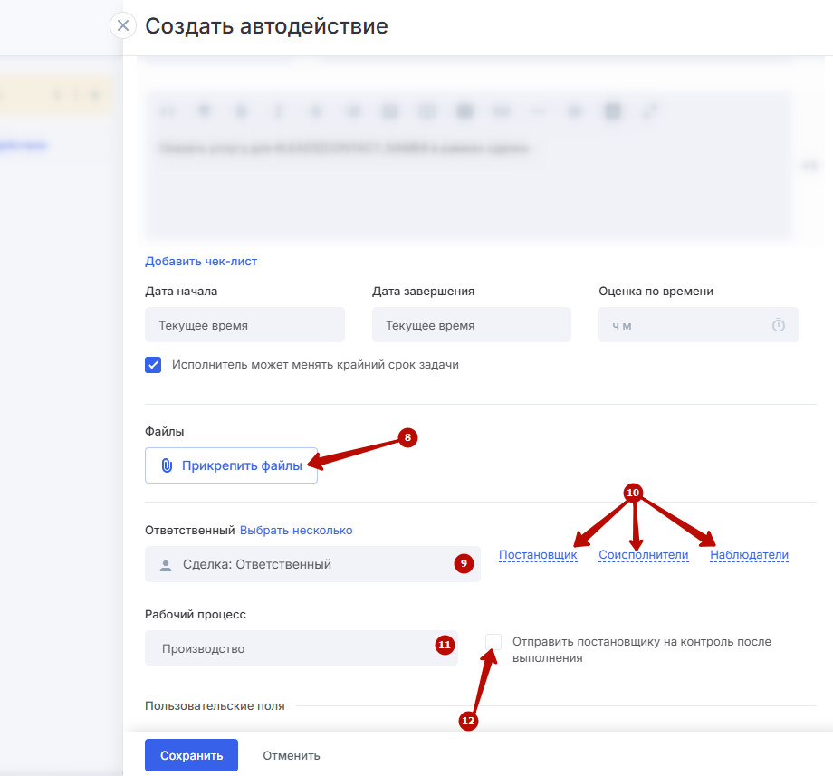 укажите ответственного (9) — конкретного пользователя или, например, ответственного по сделке;