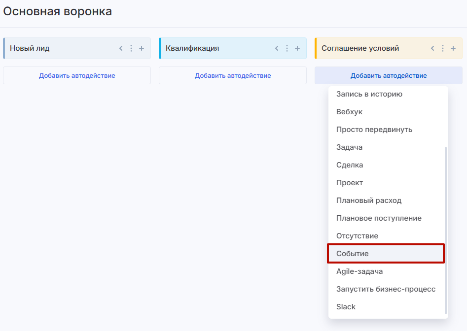 На экране «Автодействия» в воронке продаж выберите нужный этап и добавьте автодействие типа «Событие».