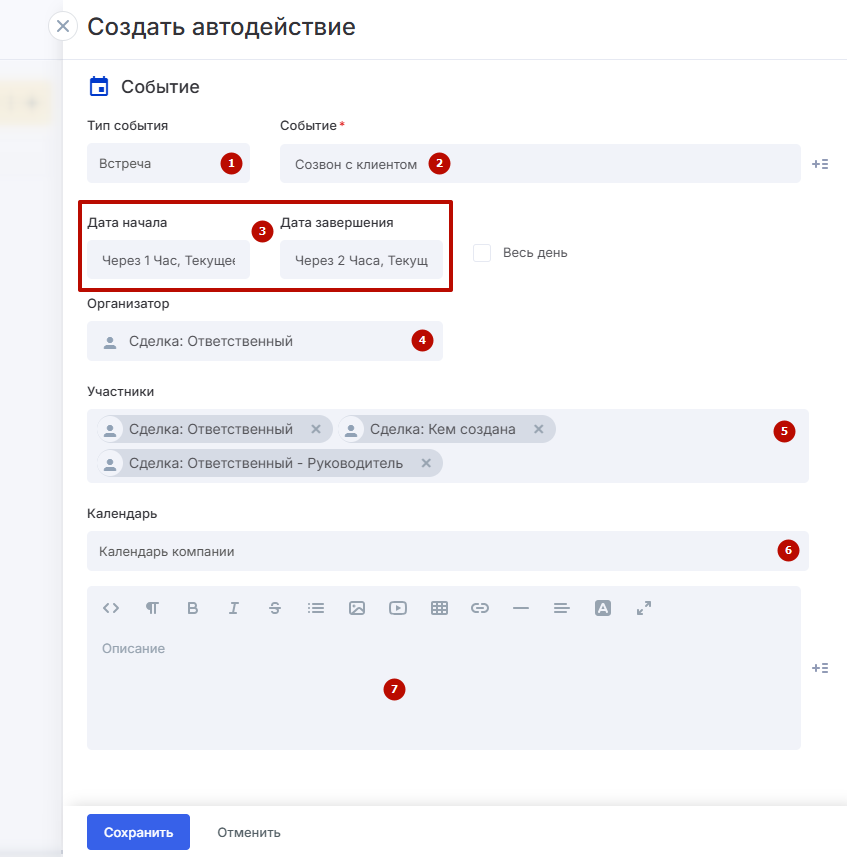 Укажите название, время и условия срабатывания автодействия. Далее задайте настройки самого события, которое будет создавать при активации автодействия: