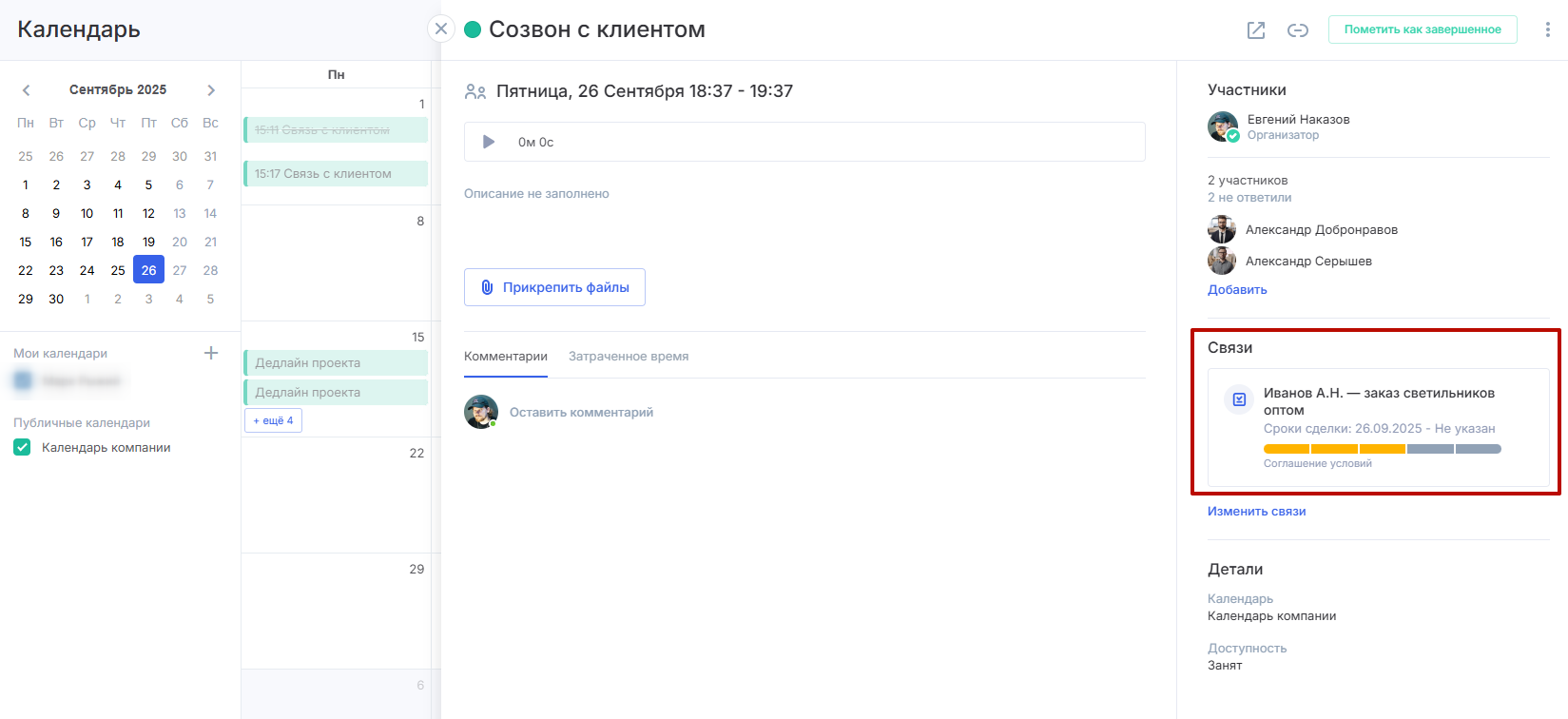 Теперь после совпадения всех условий и времени, система создаст в календаре встречу с привязкой к сделке.