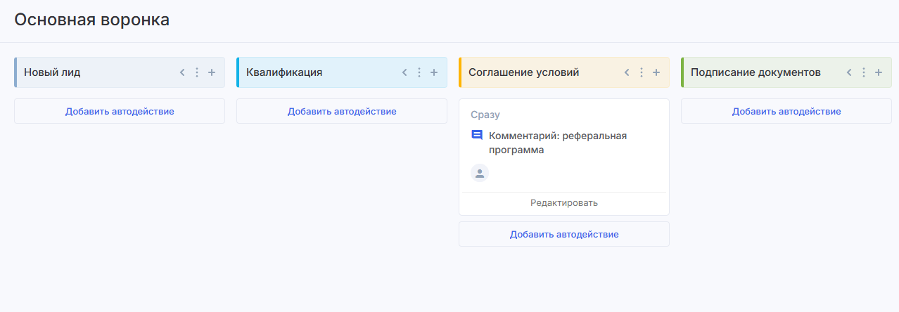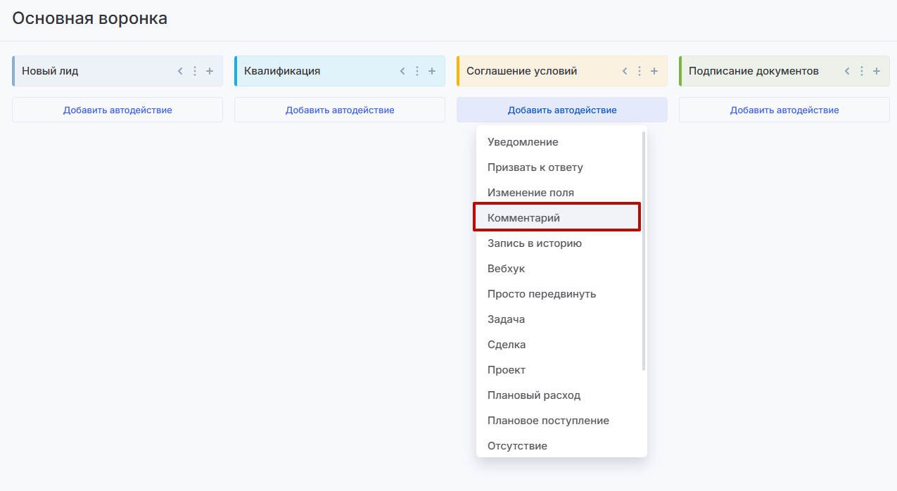 На экране «Автодействия» в воронке продаж выберите нужный этап и добавьте автодействие типа «Комментарий».