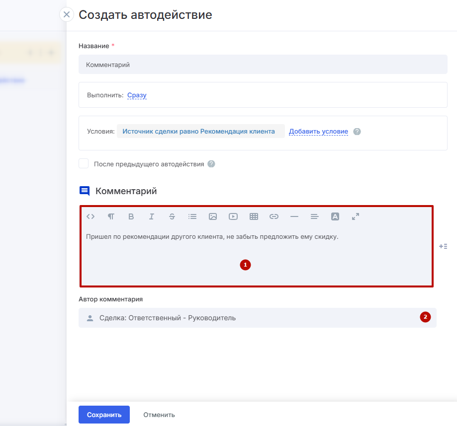 его автора (2) — от чьего имени комментарий будет отправлен. Указать можно как конкретного пользователя, так и динамическую роль — ответственного по сделке, его руководителя и так далее.