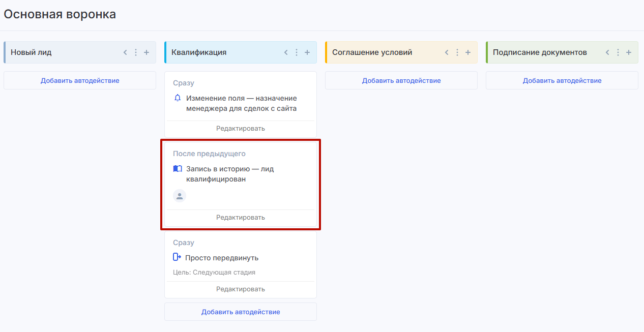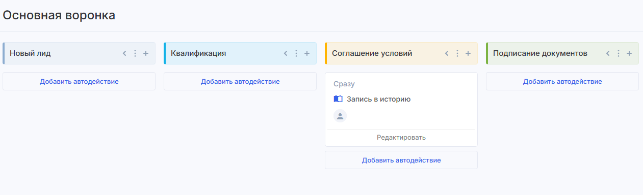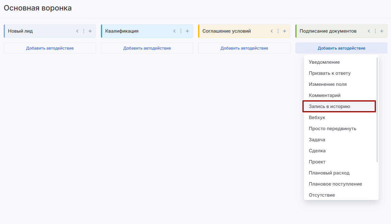 На экране «Автодействия» в воронке продаж выберите нужный этап и добавьте автодействие типа «Запись в историю».