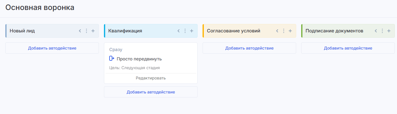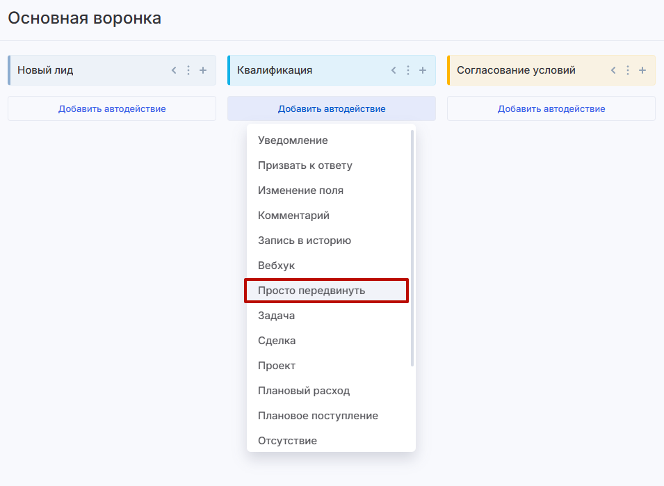 На экране «Автодействия» в воронке продаж выберите нужный этап и добавьте автодействие типа «Просто передвинуть».