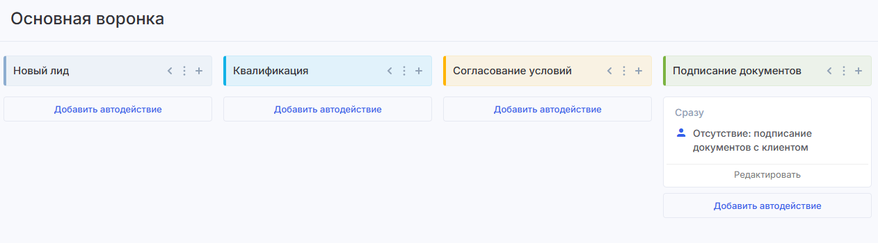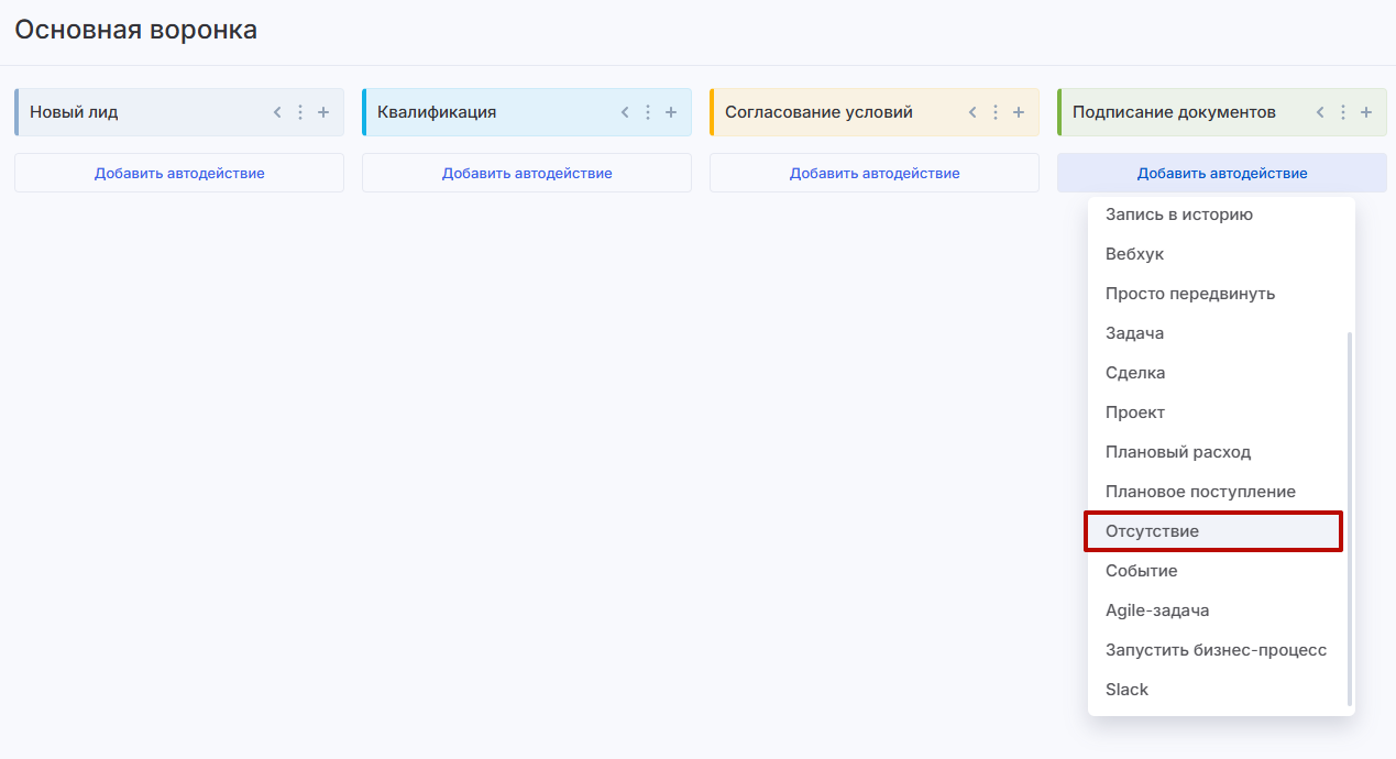 На экране «Автодействия» в воронке продаж выберите нужный этап и добавьте автодействие типа «Отсутствие».