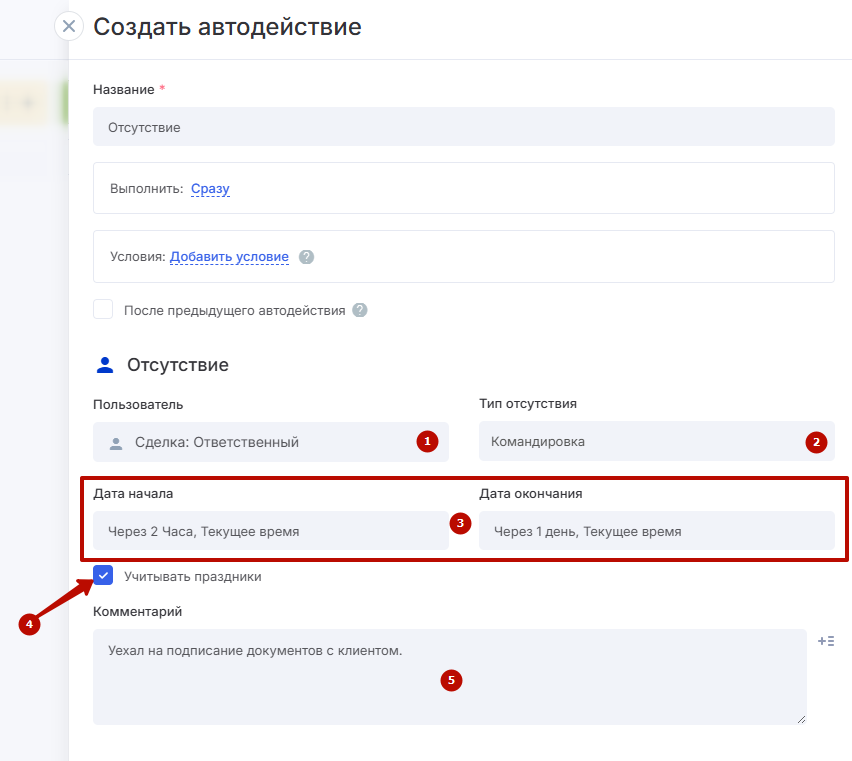 Через автодействия в CRM можно создавать отметку в модуле «Отсутствия».