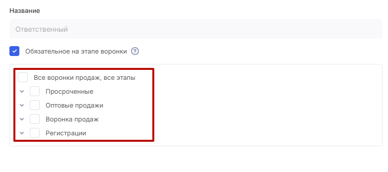 Затем выберите те воронки продаж, в которых это поле должно быть обязательным для заполнения, и проставьте галки в соответствующих чекбоксах. При необходимости можно выбрать все воронки со всеми этапами сразу.