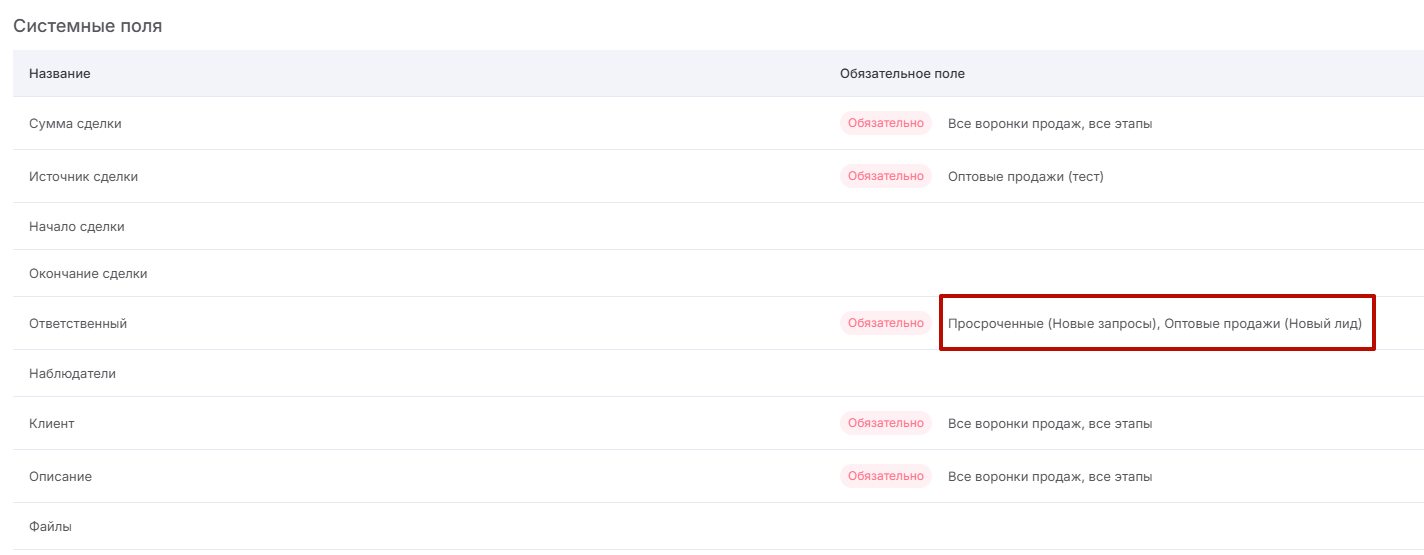 После этого настройки поля можно сохранить. Информация о том, в каких воронках и на каких этапах поле обязательно для заполнения, также будет отображена в списке.