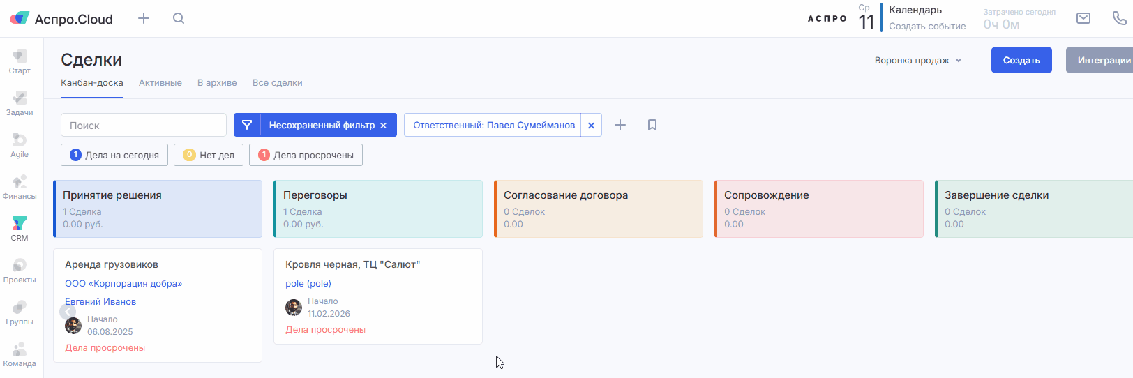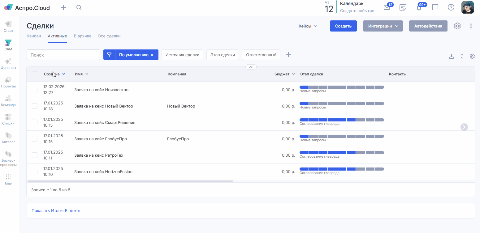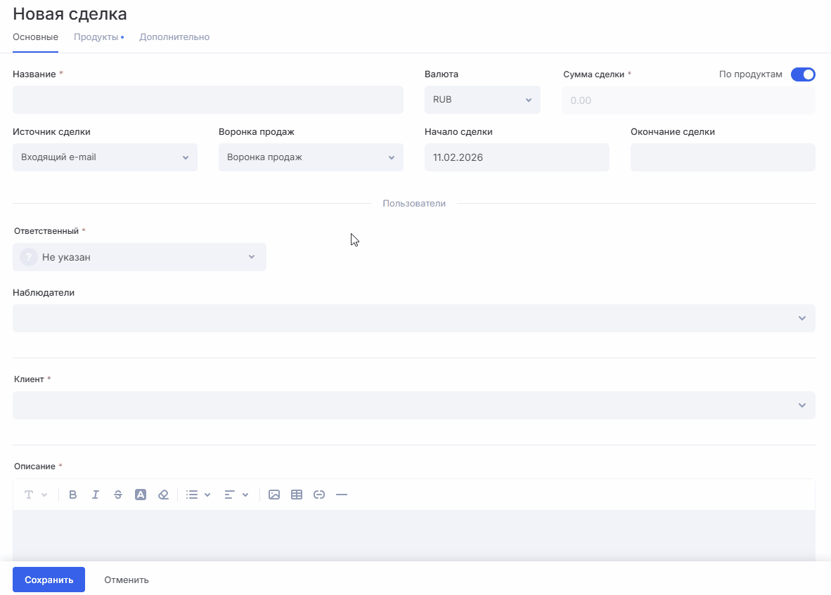 Важно: если у вас активирован расчет стоимости сделки по продуктам, а поле «Сумма сделки» сделано обязательным, быстрое создание сделки будет недоступно.