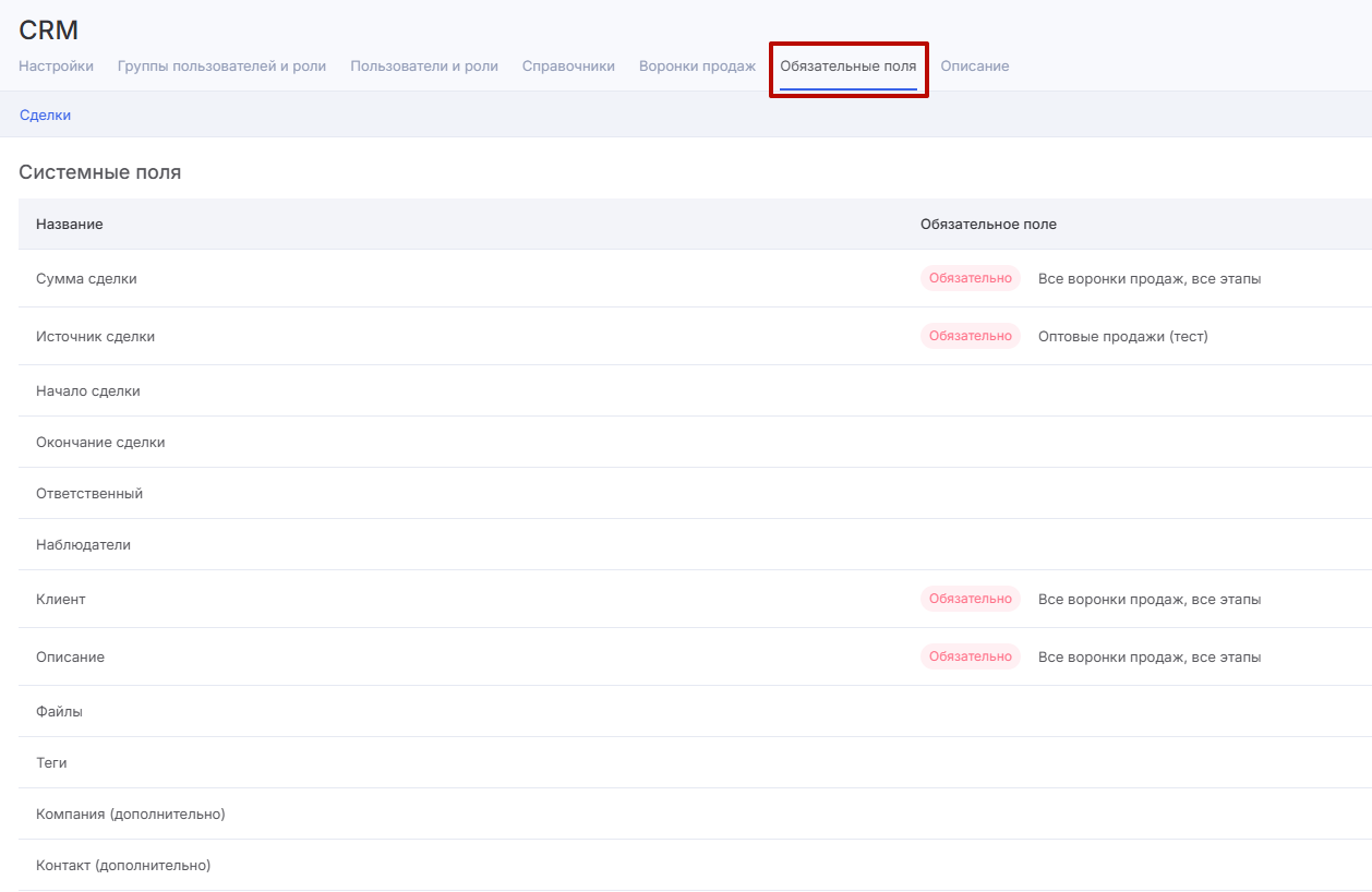 Задать обязательные для заполнения поля сделок можно в настройках модуля «CRM» — им посвящена отдельная вкладка. В ней находится список системных и пользовательских полей в сделках.