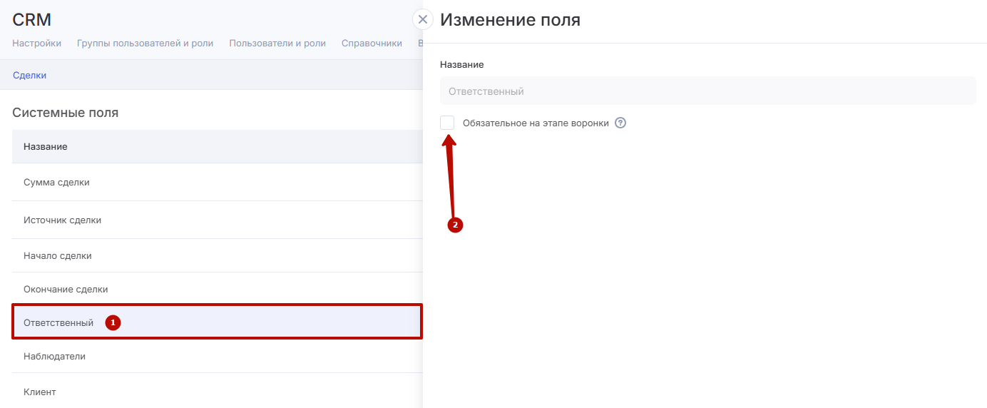 Если в вашей компании предусмотрен особый регламент работы со сделками, в модуле «CRM» вы можете настроить поля в сделках, которые будут обязательными к заполнению.