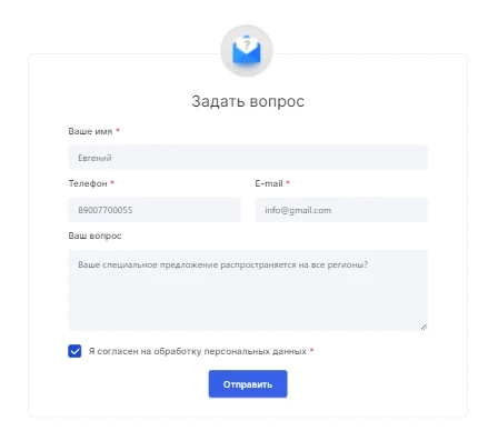 В каждой веб-форме есть обязательные для заполнения поля, а также чекбокс для согласия на обработку персональных данных, который требуется согласно законодательству.
