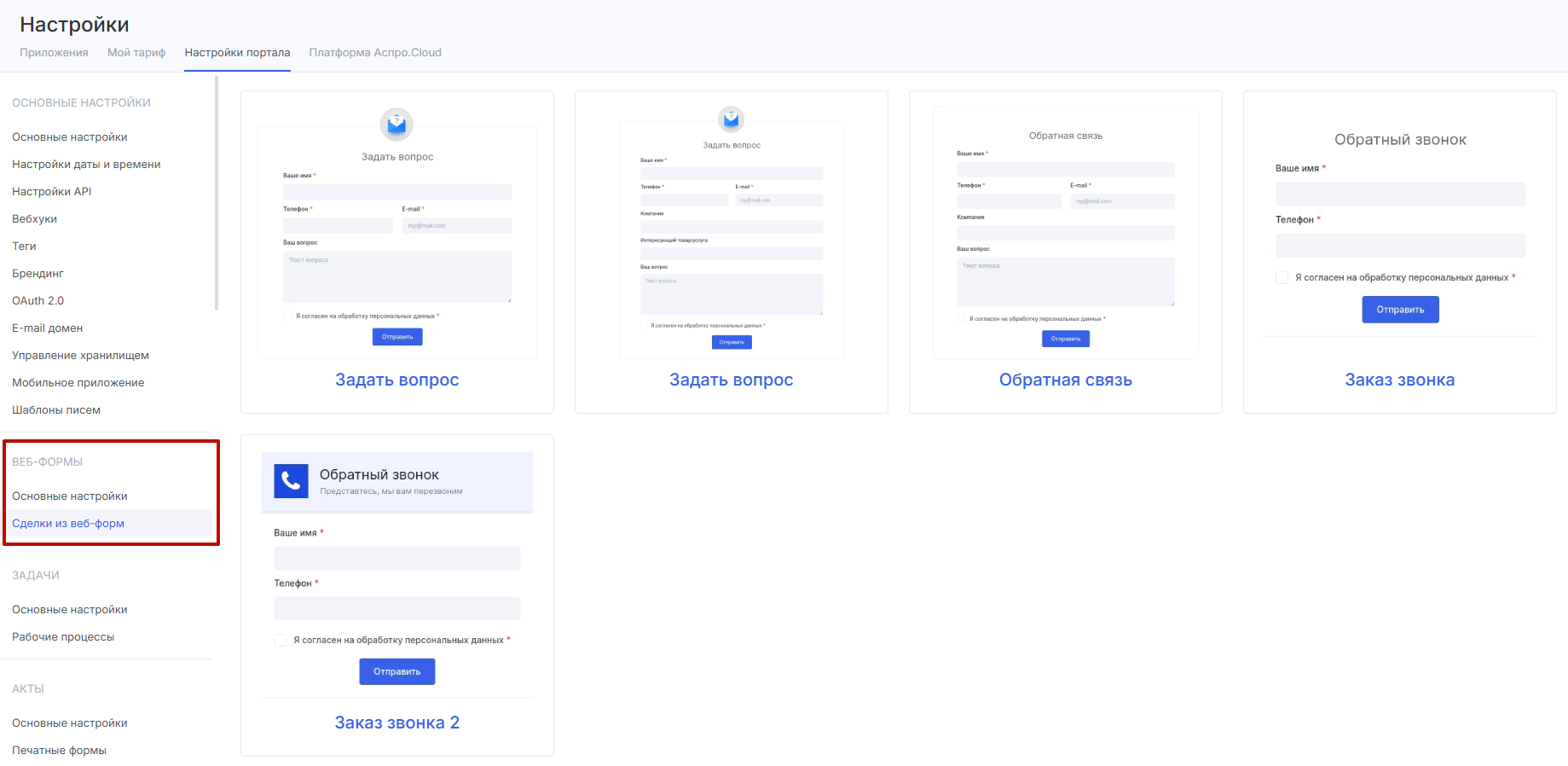 Веб-формы находятся в разделе настройках портала. В разделе «Веб-формы» перейдите во вкладку «Сделки из веб-форм». Здесь на выбор предлагаются несколько веб-форм для разных запросов: