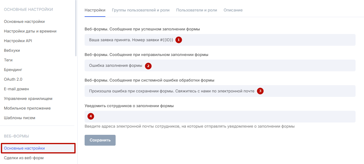 В разделе «Веб-формы» перейдите во вкладку «Основные настройки». Здесь заполните следующие поля:
