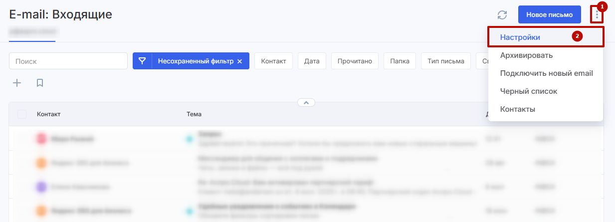 Перейдите в ваш почтовый ящик внутри Аспро.Cloud, откройте контекстное меню (1) и перейдите в настройки (2).