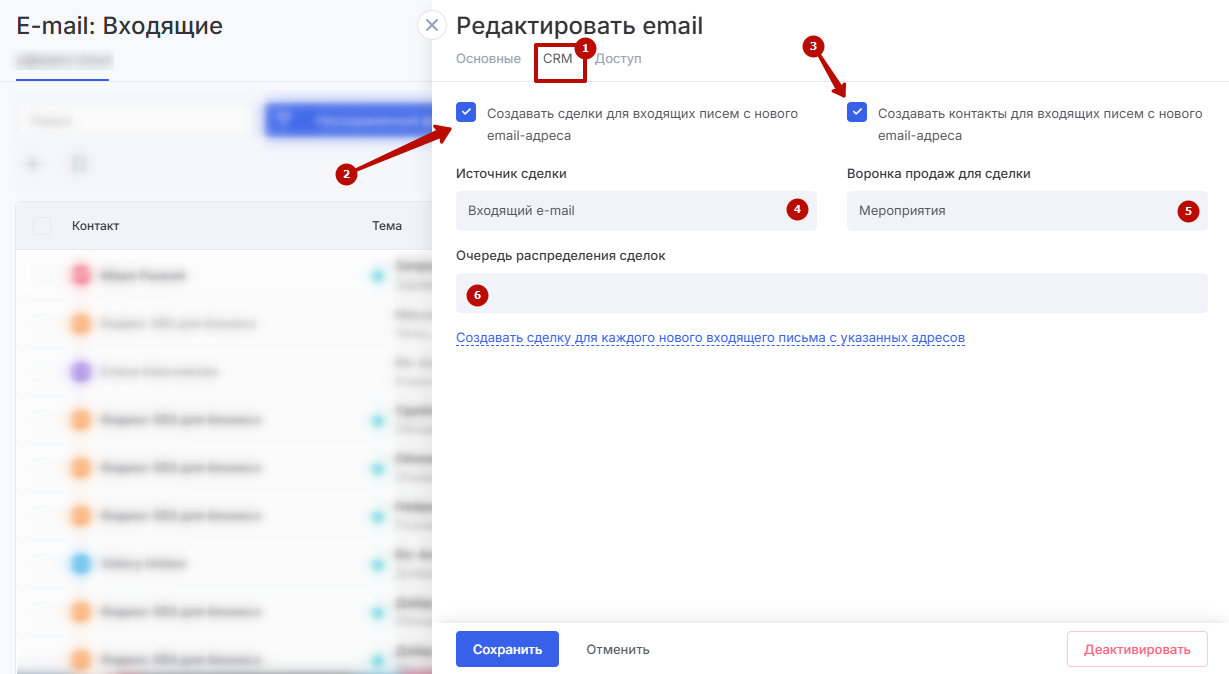 создавать сделки для входящих писем с нового email-адреса (2);