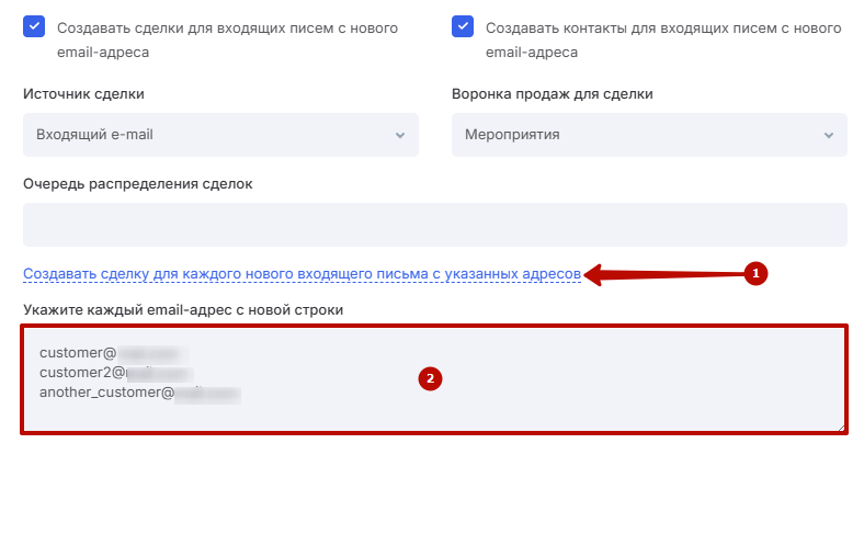 Вы также можете настроить создание сделок для каждого нового письма от указанных адресов (1). Укажите нужные email-адреса в соответствующем поле (2). Каждый новый адрес — с новой строки.