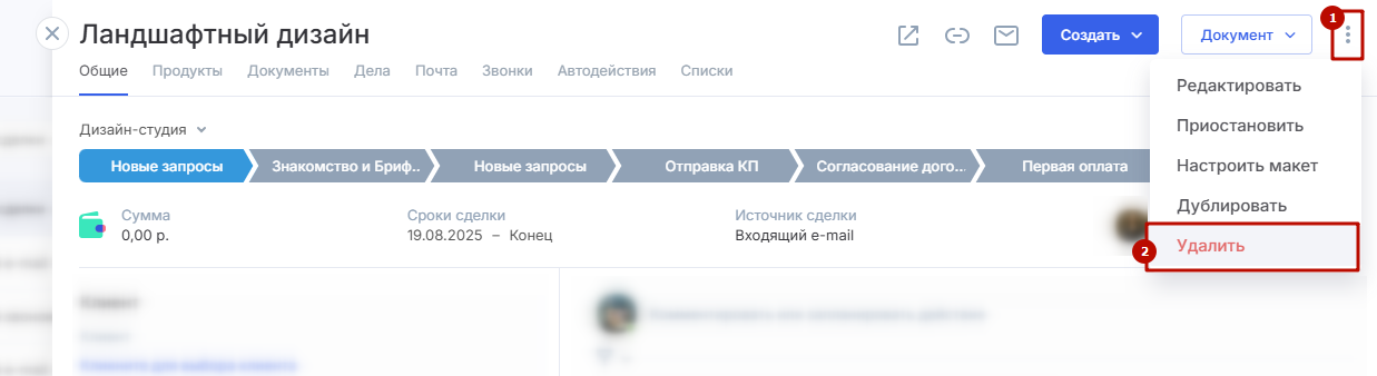 Перейдите в детальную страницу нужной сделки. Откройте контекстное меню в правом верхнем углу (1) и выберите пункт «Удалить» (2).