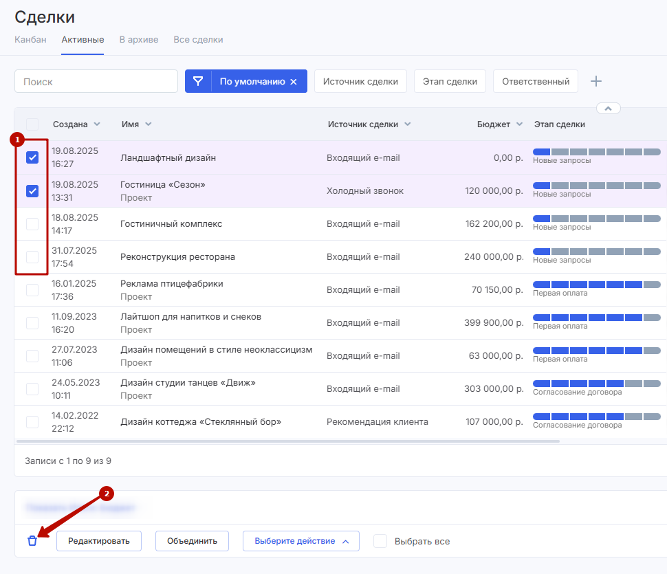 Перейдите в нужный список, выберите одну или несколько сделок, которые хотите удалить, постановкой галки в чекбокс (1). После этого под результирующей строкой появится иконка удаления (2).