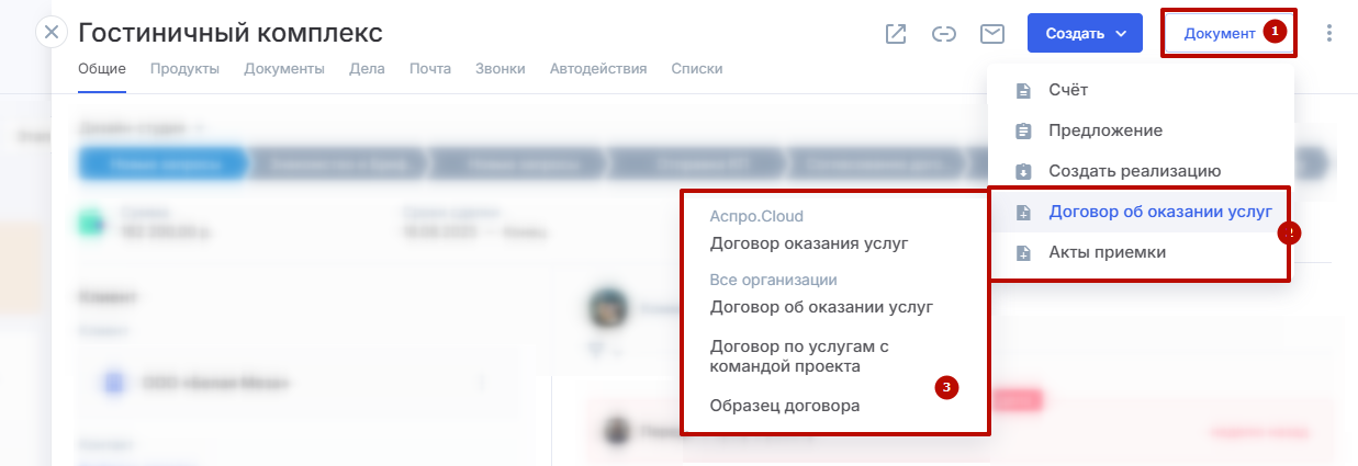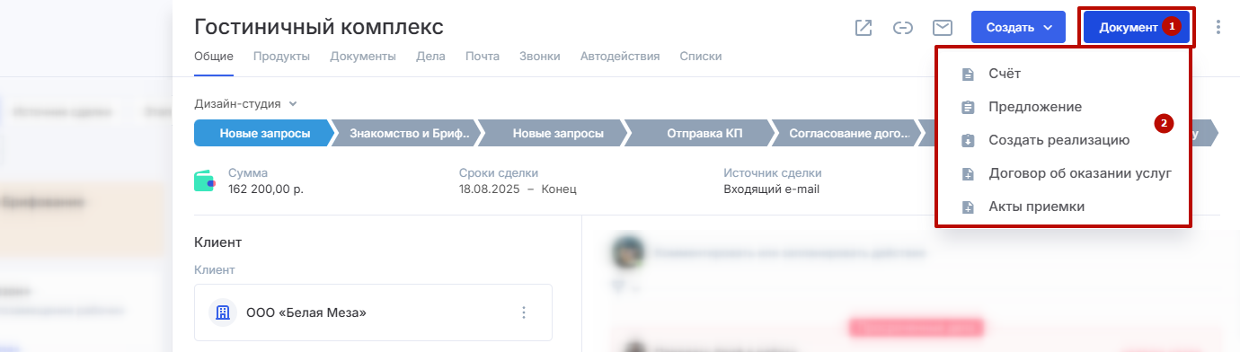 Перейдите в нужную сделку и нажмите кнопку «Документ» (1) — она откроет меню выбора, в котором будут представлены доступные типы документов (2). Выберите нужный.