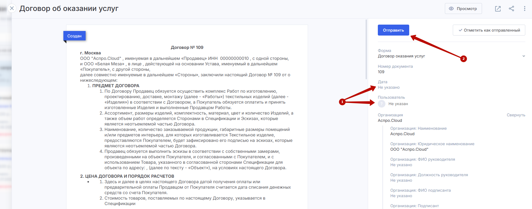 Здесь вы также сможете заполнить дополнительную информацию в полях документа (1) и/или отправить его контрагенту (2).