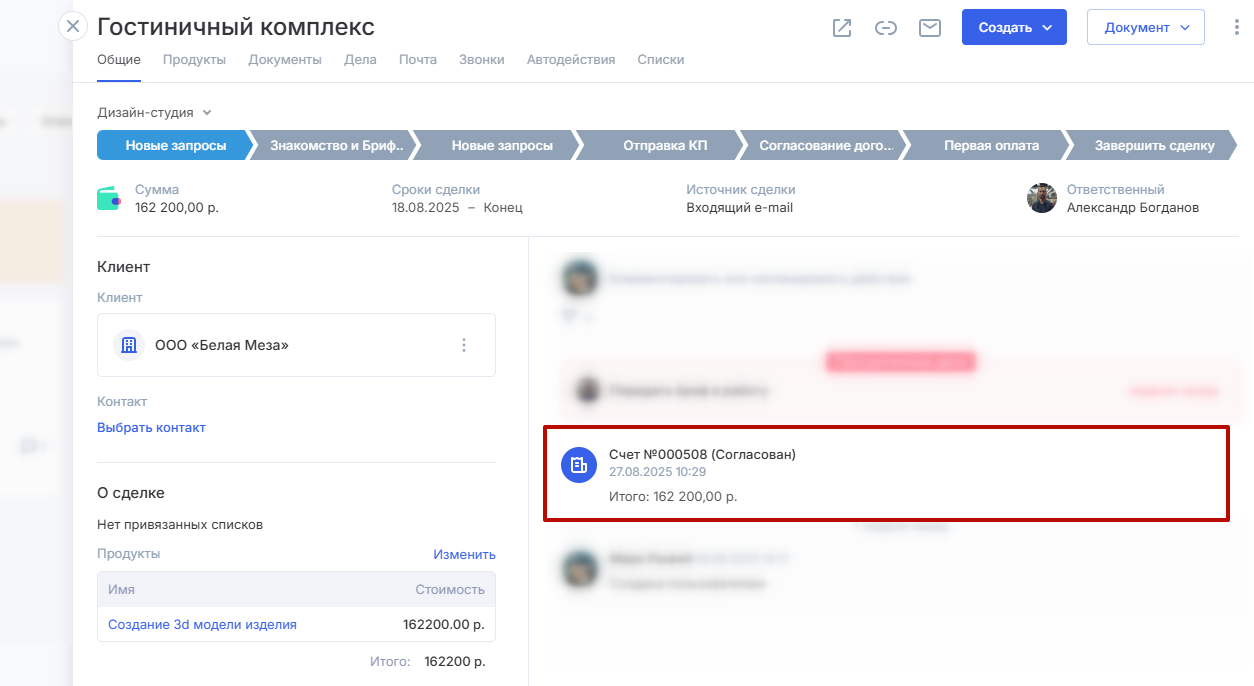 По мере продвижения сделки вам могут понадобиться различные документы — договор, счет на оплату, акт выполненных работ и другие. Создать их можно прямо из сделки — без перехода к модулям «Документы» или «Финансы».