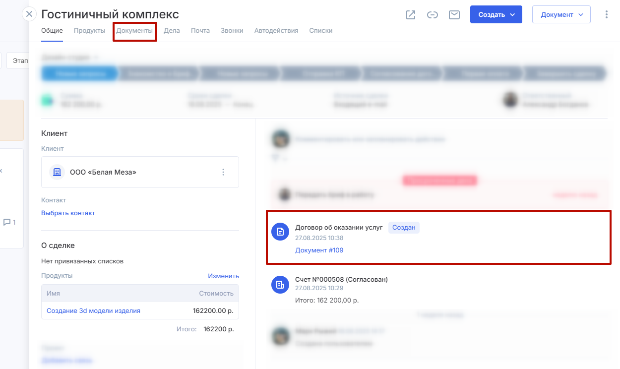 Перед вами откроется его детальная страница. Документ будет сразу же создан из шаблона — нужна информация из сделки подтянется на место переменных.