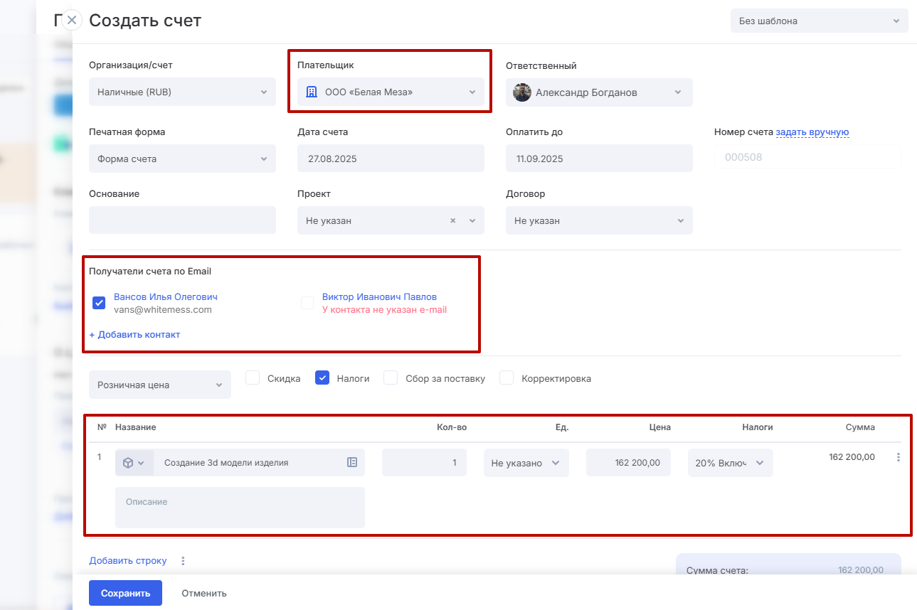 Если вы создаете счет или предложение, перед вами откроется редактор документа. Из сделки туда уже подтянутся данные о контрагенте, продуктах и стоимости. Вам останется лишь заполнить оставшиеся поля и сохранить документ.
