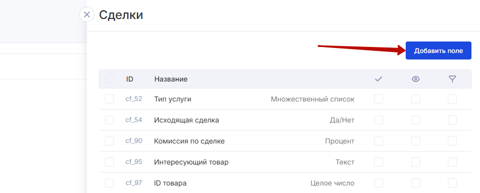 Вы увидите вкладку со списком пользовательских полей, которые были созданы для сделок. Чтобы добавить новое поле, нажмите кнопку «Добавить поле».