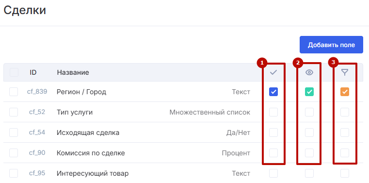 фильтр (3) — добавляет поле в фильтры и открывает возможность фильтровать пользователей по значению этого поля.