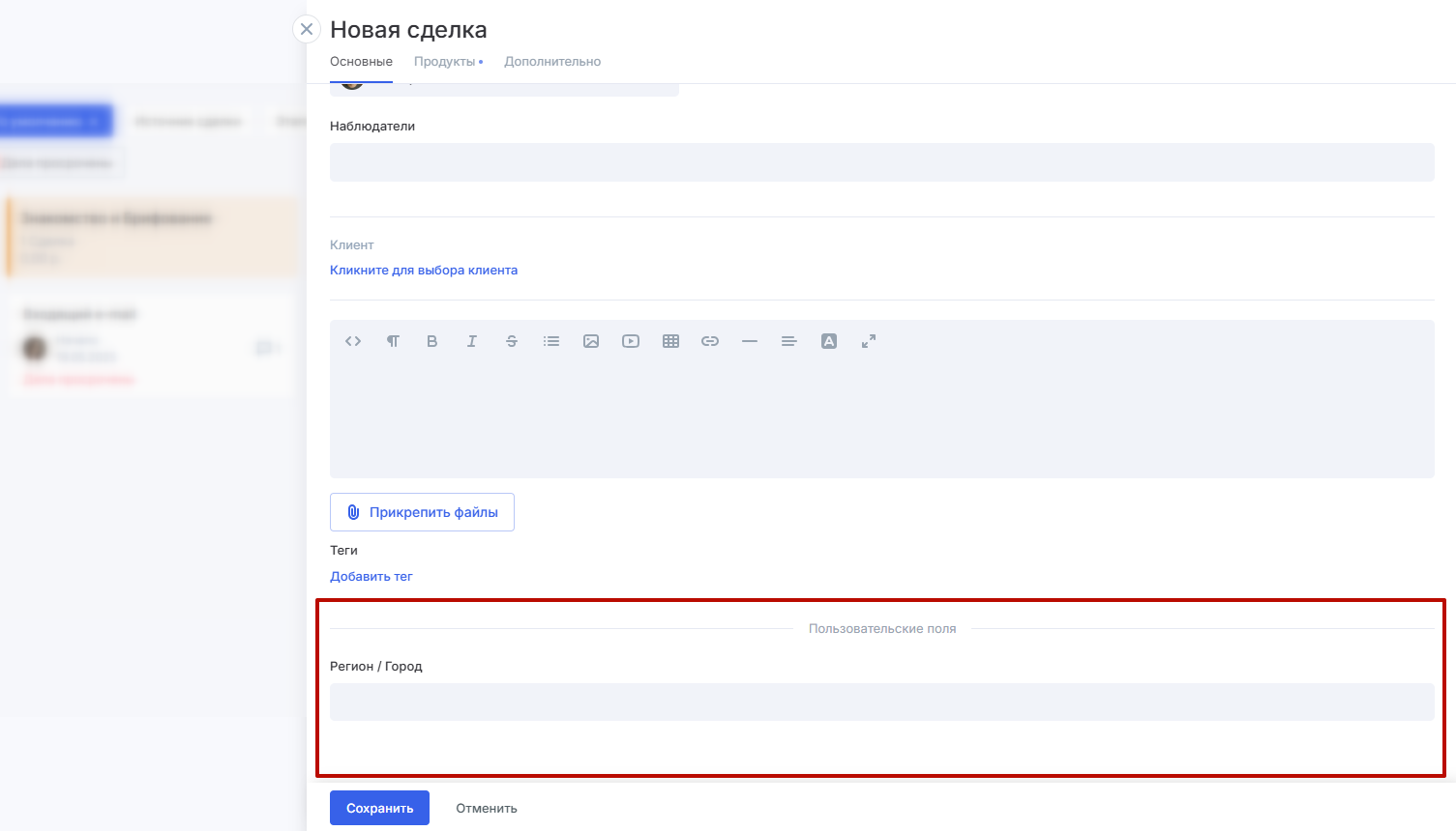 Если вам нужно указать дополнительную информацию, например, дополнительные сведения о клиенте, особые классификаторы сделки или данные для других сотрудников, вы можете добавить ее через пользовательские поля.