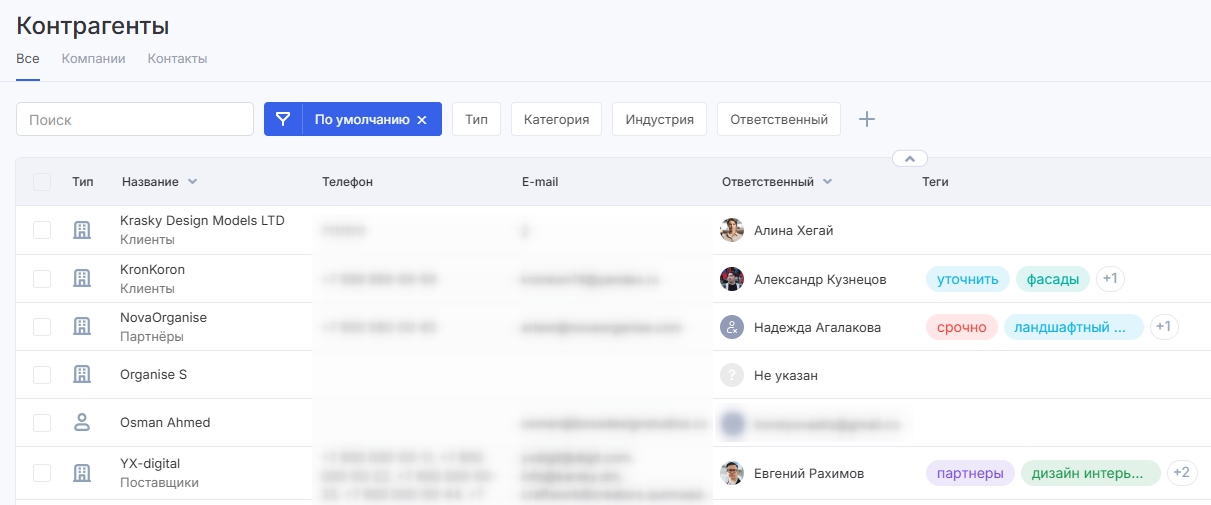 Контакты — физические лица. Контакты могут выступать в роли отдельных контрагентов в сделках, а могут быть привязаны к компаниям.