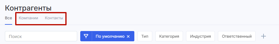 Каждой категории контрагентов посвящена отдельная вкладка со списком в разделе «Контрагенты».