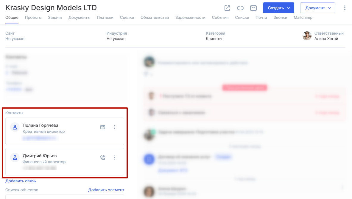 Несмотря на то, что компании и контакты в системе представляют собой отдельные самостоятельные сущности, их можно свободно привязывать друг к другу.