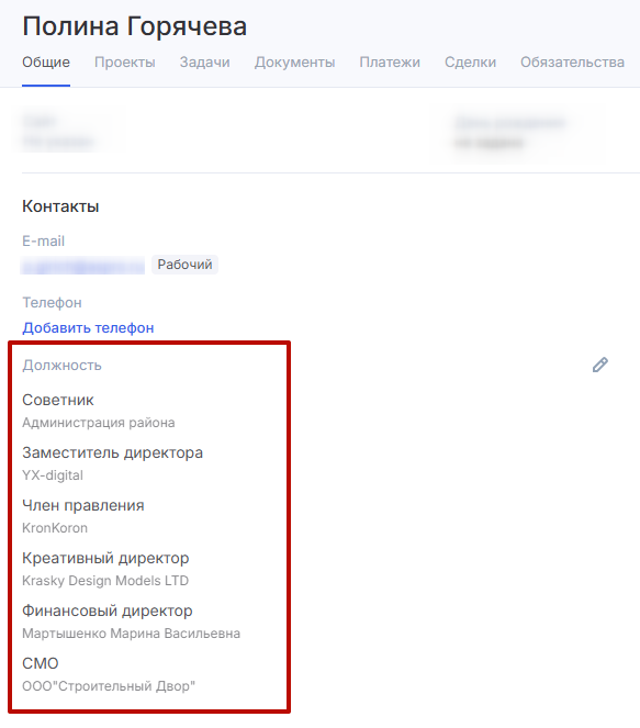 Точно так же один контакт может быть привязан к нескольким компаниям — если в разных предприятиях он занимает разные должности параллельно.