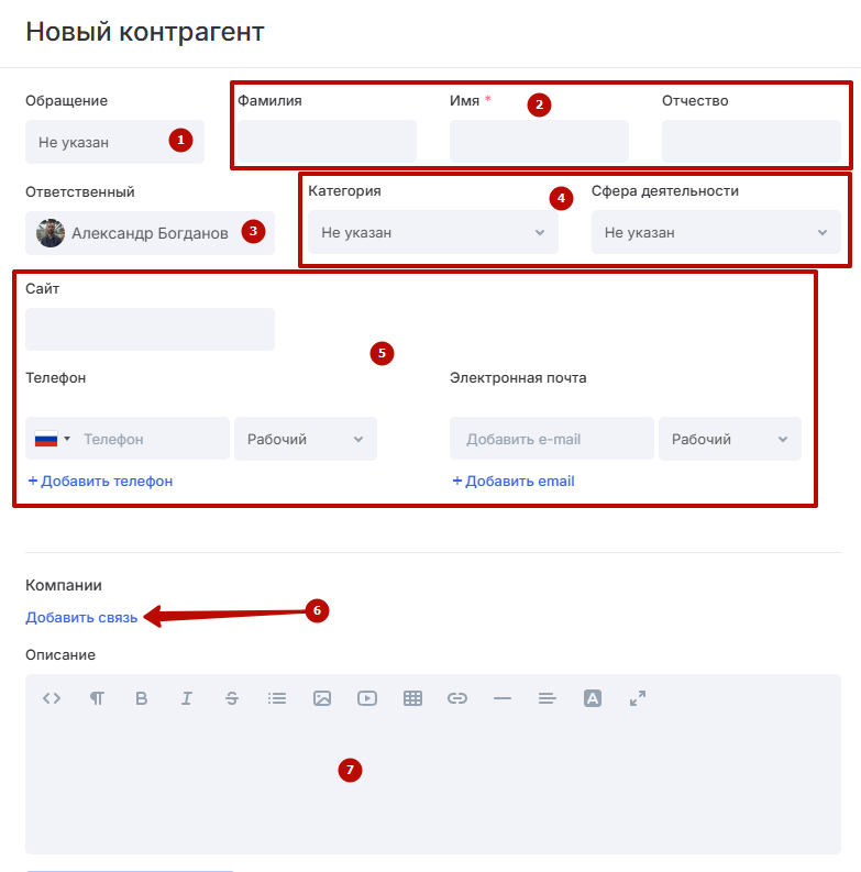 Процесс создания контакта аналогичен процессу создания компании. Отличаются лишь поля.