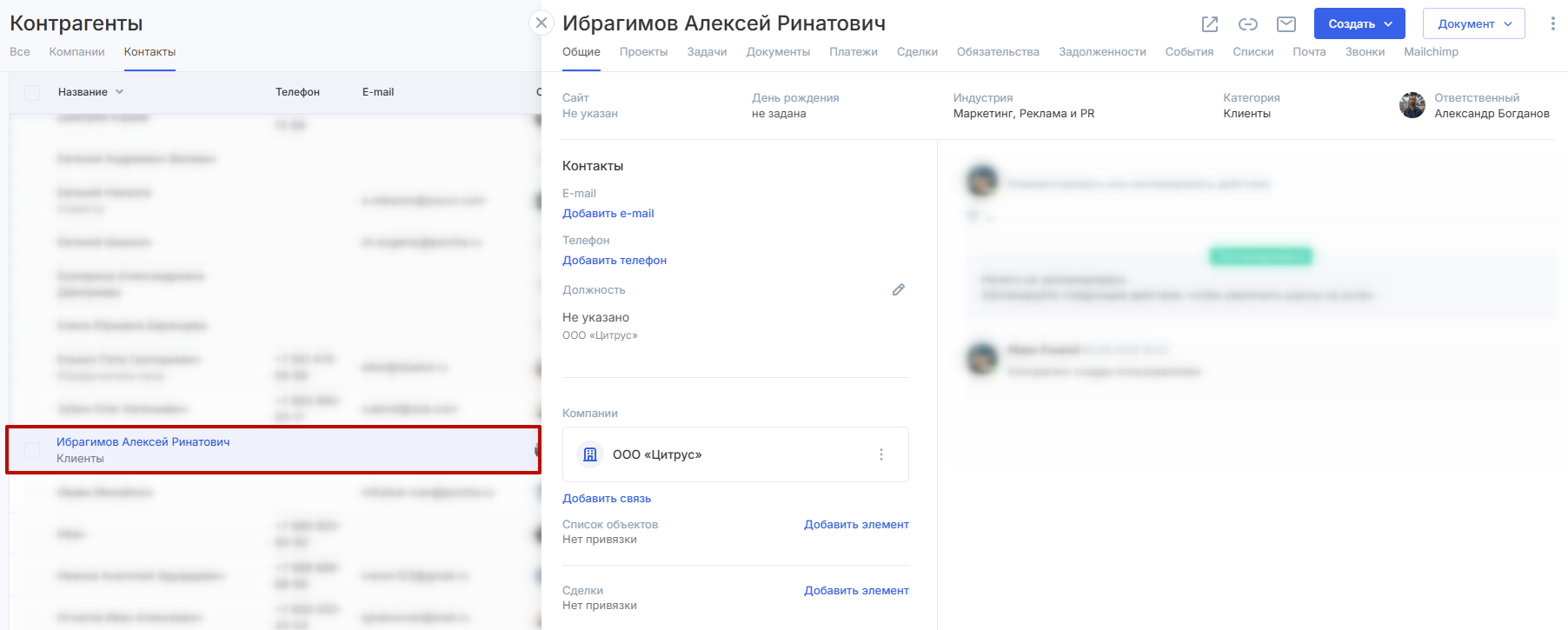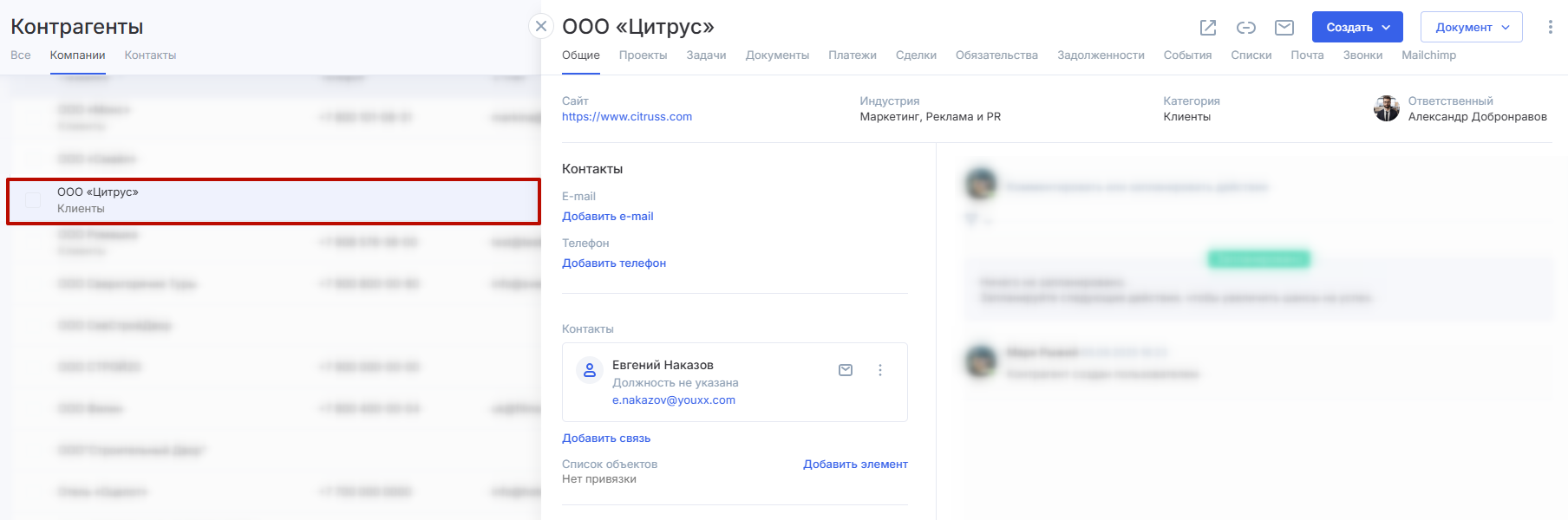 контакты (6) — конкретные физические лица-контрагенты, которые связаны с этой компанией; к компании можно прикрепить существующие контакты;