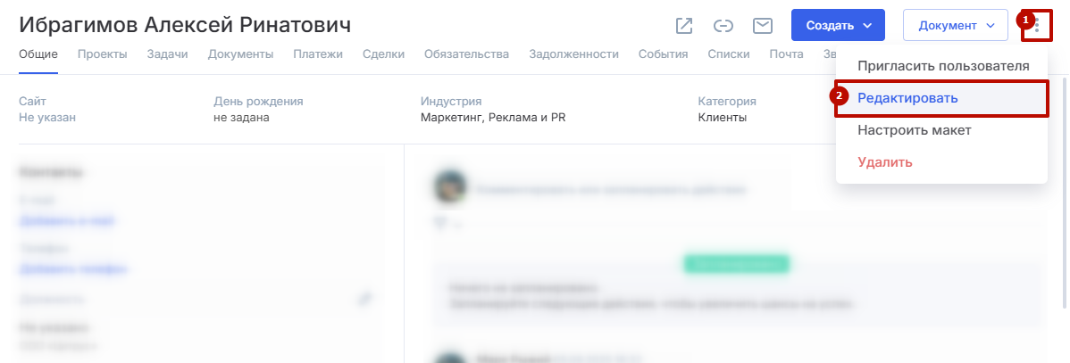 Чтобы отредактировать данные контрагента, перейдите в его карточку, откройте контекстное меню в правом верхнем углу (1) и выберите пункт «Редактировать» (2).