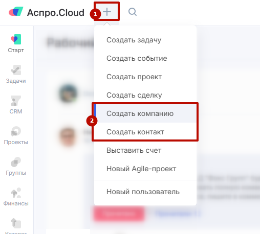 Нажмите на иконку в виде плюса в верхней панели интерфейса (1) и выберите нужный вид контрагента (2).