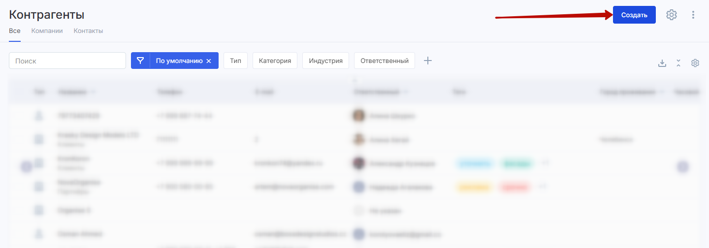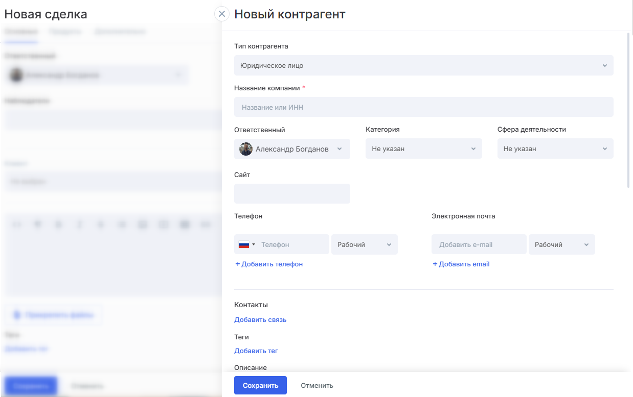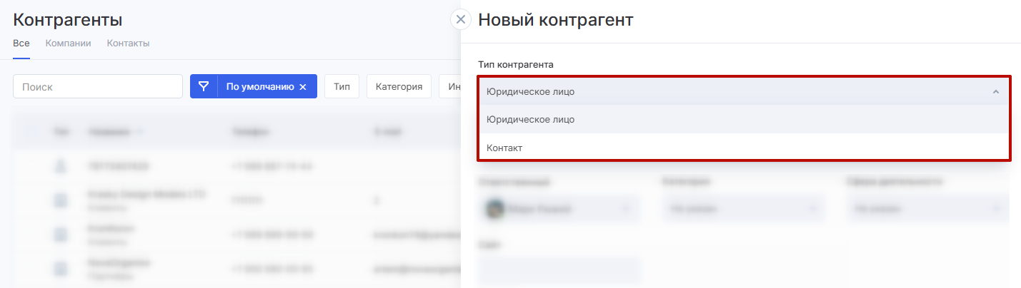 Если вы создаете контрагента в разделе «Компании» или «Контакты», тип контрагента будет выбран соответствующий.