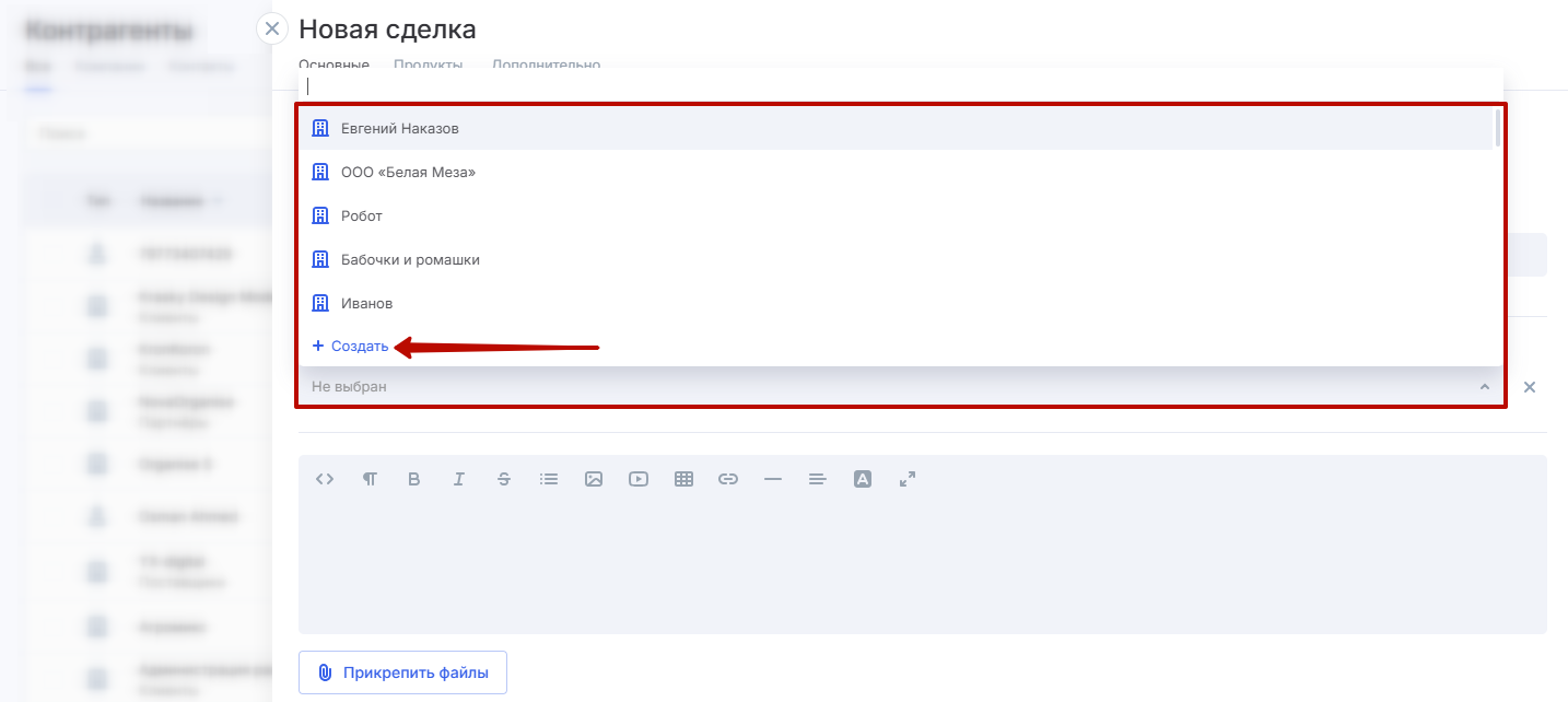 В форме создания сделки нажмите на поле «Клиент» и в открывшемся селекторе выберите пункт «Создать».