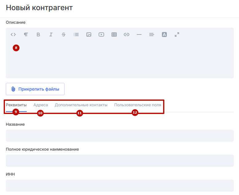 Чтобы создать контрагента-юридическое лицо, заполните следующие поля: