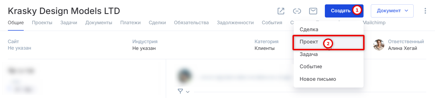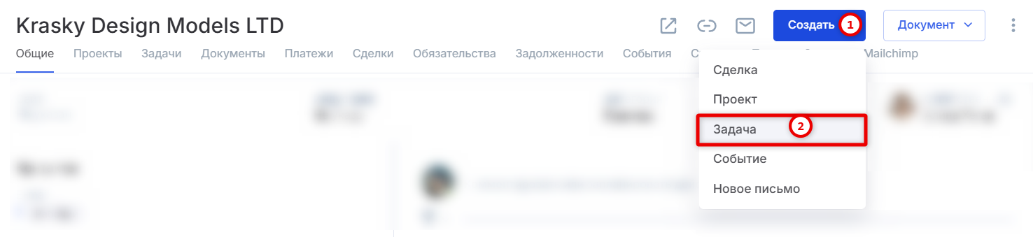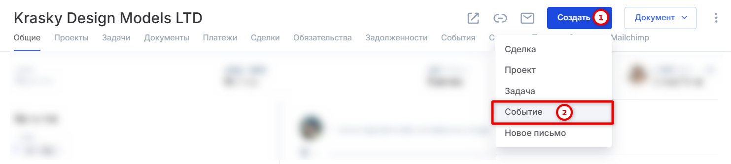 - Создание задачи, события или проекта из контрагента