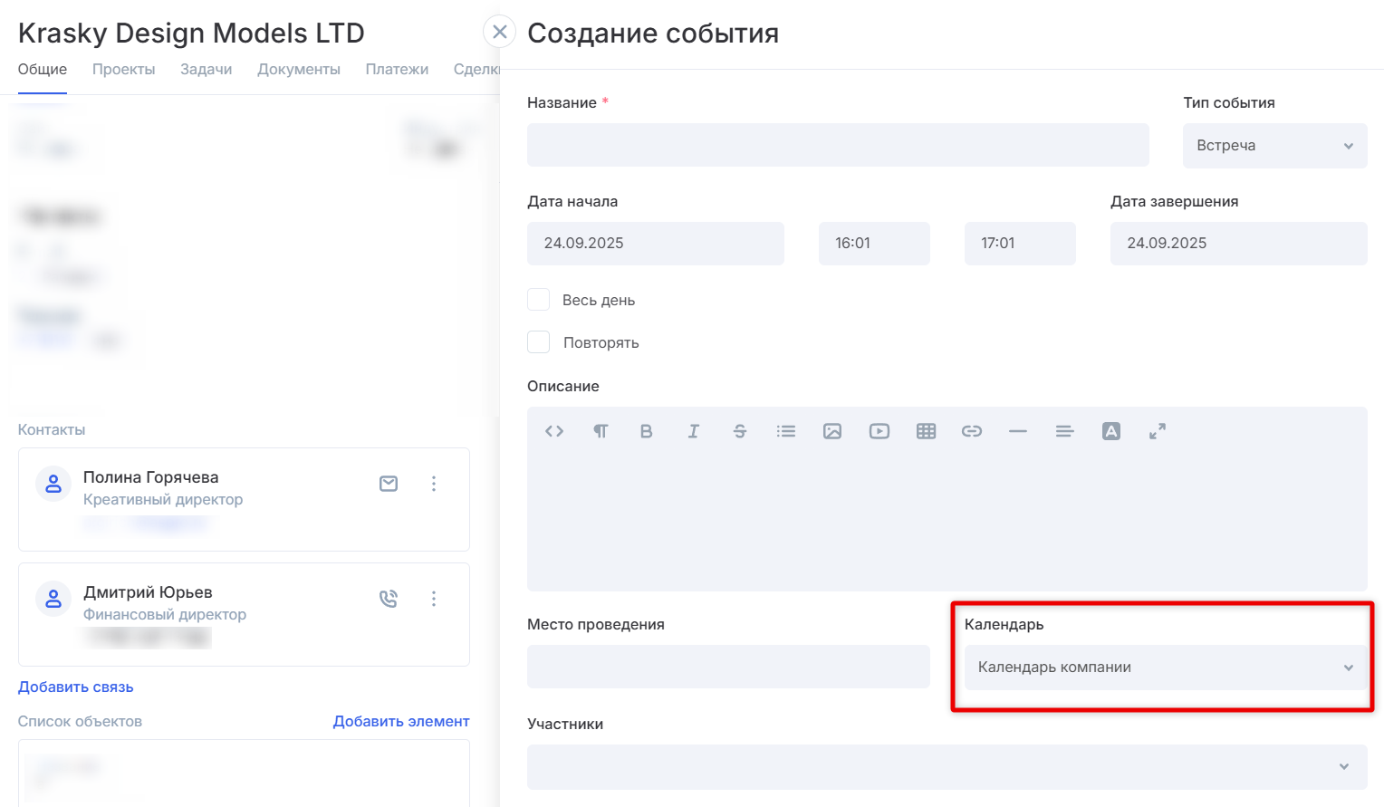 Перед вами появится форма создания события. Выберите календарь и заполните остальные поля.