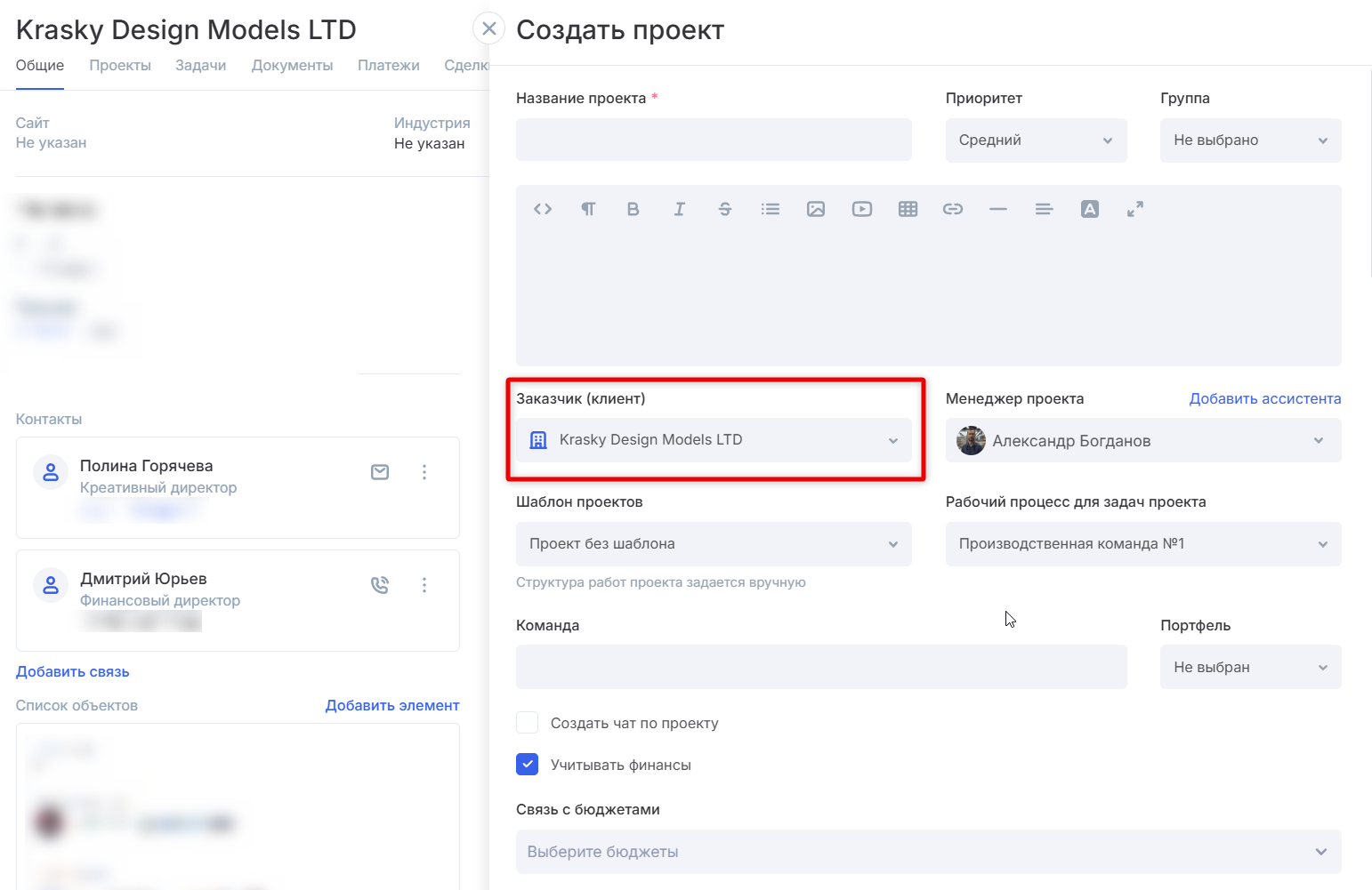 Перед вами откроется форма создания проекта. Контрагент автоматически подтянется в поле «Заказчик». Вам останется лишь заполнить остальные поля и — при необходимости — выбрать шаблон.