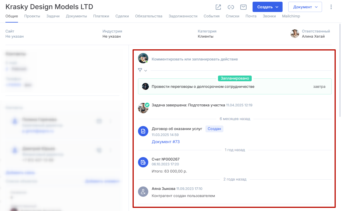 Информация обо всех созданных сущностях будет отражена в ленте взаимодействия с контрагентом.