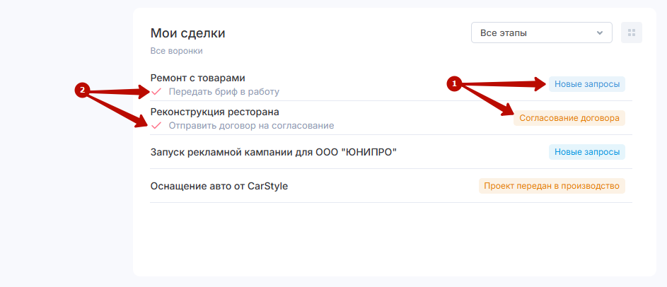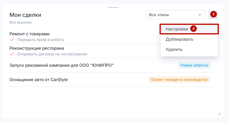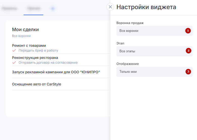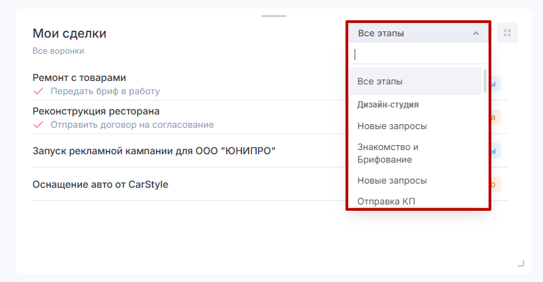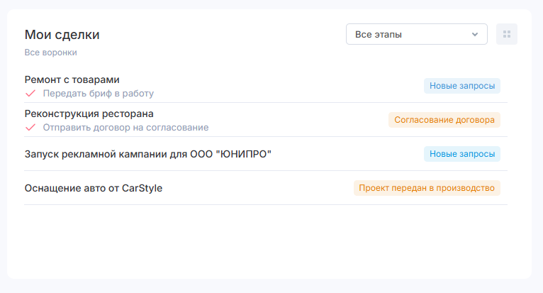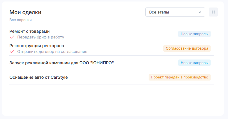 По умолчанию в виджете будут показаны все активные сделки с вашим участием, но при необходимости вы сможете выбрать конкретный этап в нужной воронке — через селектор.